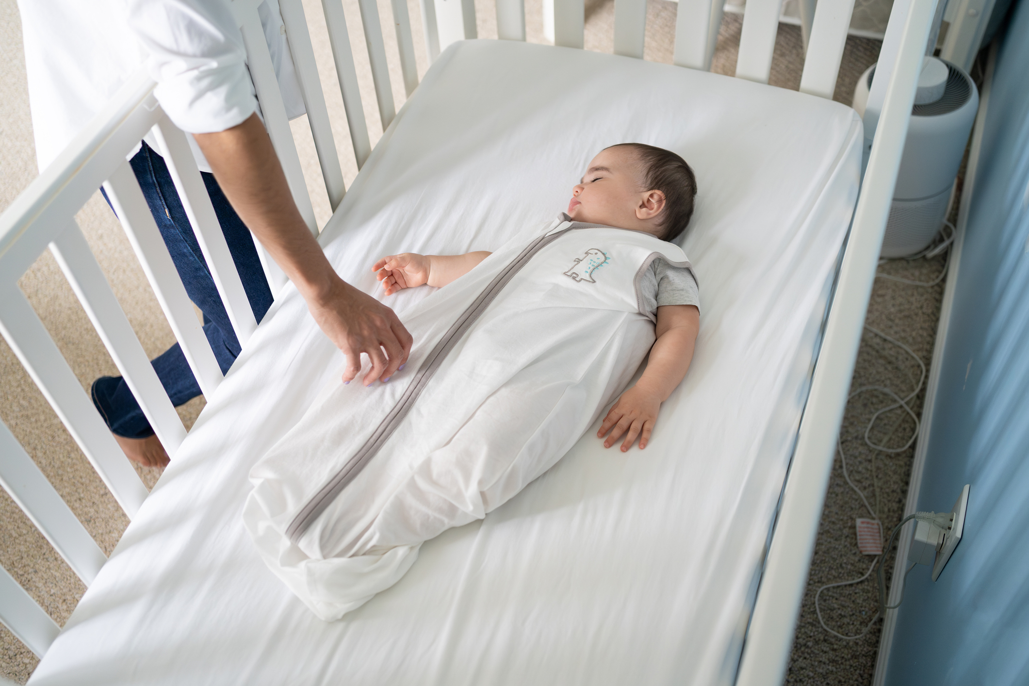 Use a safety-approved crib, bassinet, or portable play yard with a firm mattress and fitted sheet. No pillows, blankets, toys, or bumpers should be in the sleep area.